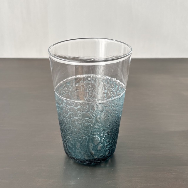 グルーチップで模様をつけたグラスです。 上部はクリアガラス、下部に透明な緑の色ガラスを一番外側に被せて、 ロックグラスの形に吹き上げます。 色がついた部分だけにサンドブラストをします。 膠(にかわ)を塗り、乾燥して縮む力に任せて ガラスの表面を薄く剥ぎ取り模様をつけました。 膠が剥ぎ取らなかった部分はサンドブラスト後のすりガラス状になっています。 底に向かって厚みを増しているので、どっしりしています。 昭和の時代、窓ガラスに多くみられた模様です。 膠の乾燥具合で模様が変わるため、同じものはありません。 色味は渋目の青みがかった緑色で落ち着いた印象にしました。 *耐熱ガラスではありません。 *他サイトでも販売しており、先着順での販売となりますので、 万一売り切れの場合にはキャンセルでの対応となりますことをご了承くださいませ。 大きさ 口径7.9cm×底径5.4cm×高さ7.9cm 136g
