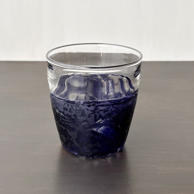 グルーチップで模様をつけたグラスです。 上部はクリアガラス、下部に透明な濃い紫色の色ガラスを一番外側に被せて、 ロックグラスの形に吹き上げます。 色がついた部分だけにサンドブラストをします。 膠(にかわ)を塗り、乾燥して縮む力に任せて ガラスの表面を薄く剥ぎ取り模様をつけました。 膠が剥ぎ取らなかった部分はサンドブラスト後のすりガラス状になっています。 底に向かって厚みを増しているので、どっしりしています。 上部のクリアガラスは口元だけ薄めで、 色に接するところはぶ厚くなっています。 昭和の時代、窓ガラスに多くみられた模様です。 膠の乾燥具合で模様が変わるため、同じものはありません。 色味は渋目の青みがかった紫色で落ち着いた印象にしました。 5枚目の写真では150ccのオレンジジュースを入れています。 (ロックグラス以外のものは付属しません) *耐熱ガラスではありません。 *他サイトでも販売しており、先着順での販売となりますので、 万一売り切れの場合にはキャンセルでの対応となりますことをご了承くださいませ。 大きさ 口径8cm×底径5.5cm×高さ8.4cm 188g