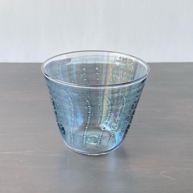吹きガラスのカップです。 そば猪口の大きさ・形を目安にしています。 めんちょことして使う他、 デザートカップや小鉢・コップとしてなど 色々お使いいただける大きさだと思います。 紺色と水色のガラス棒を内側に横、外側に縦になるように並べて 1枚に焼いたプレートを筒にして、底にクリアガラスを付けてカップ型に成形しました。 丸い棒を重ねているので、隙間となった部分には 泡が閉じ込められて並んでいます。 色ガラス棒はクリアガラスの外に色ガラスを付けて、 もう一度クリアガラスを巻いてから棒状に引き延ばしています。 色ガラスごとに違う柔らかさの違いにより 表面が凸凹しています。 小さい泡が数カ所に入っているのと ガラス棒をカットした際の切り跡が ごく細かい白い泡の筋状になっています。 5枚目の写真ではフルーツゼリーを盛り付けてみました。 (コースター・スプーン・箸置きは付属しません) *耐熱ガラスではないので熱いものを入れたり 食器洗浄機でのご使用はお勧めしません。 *他サイトでも販売しており、先着順での販売となりますので、 万一売り切れの場合にはキャンセルでの対応となりますことをご了承くださいませ。 大きさ 口径7.3cm×底径4.7cm×高さ7.3cm 重量93g