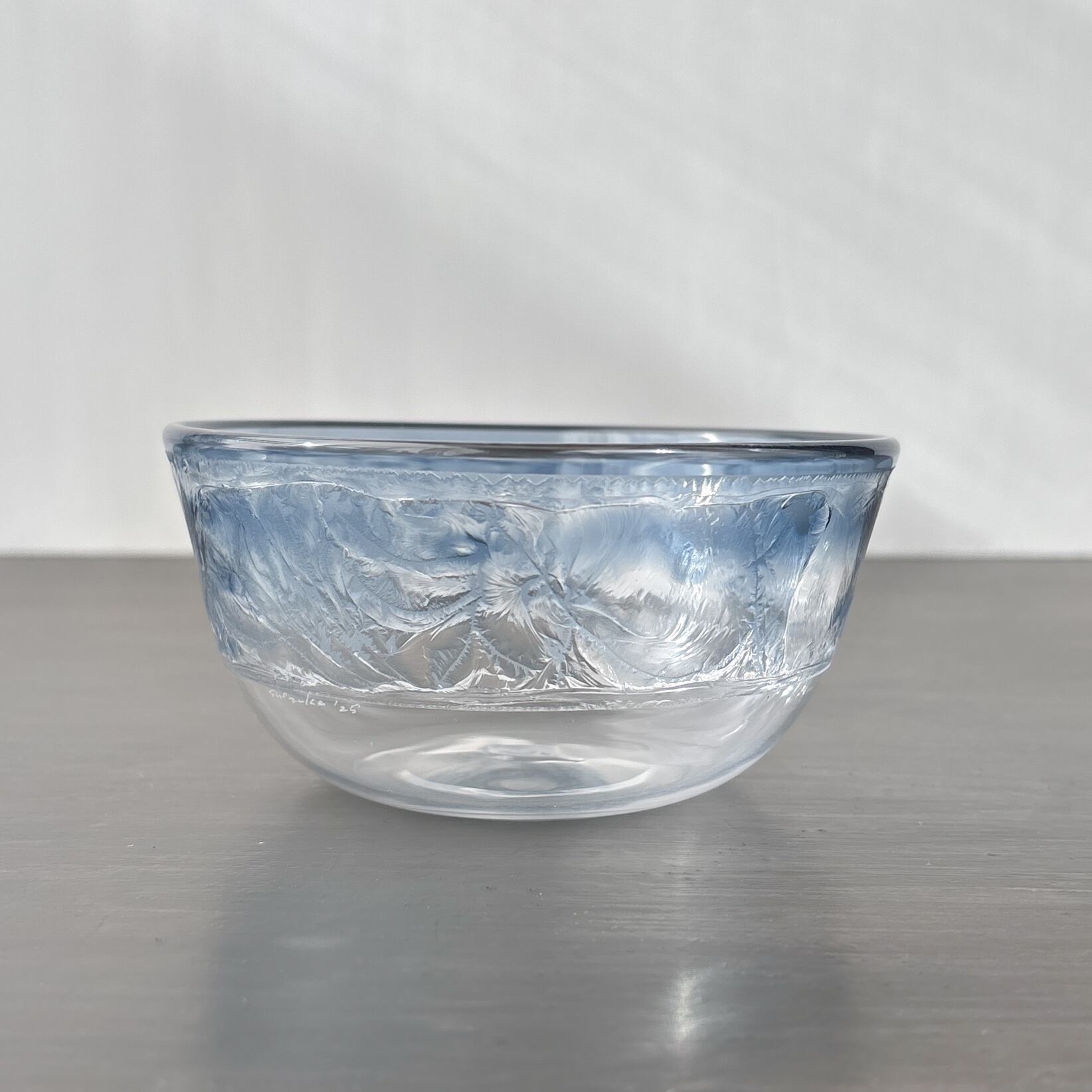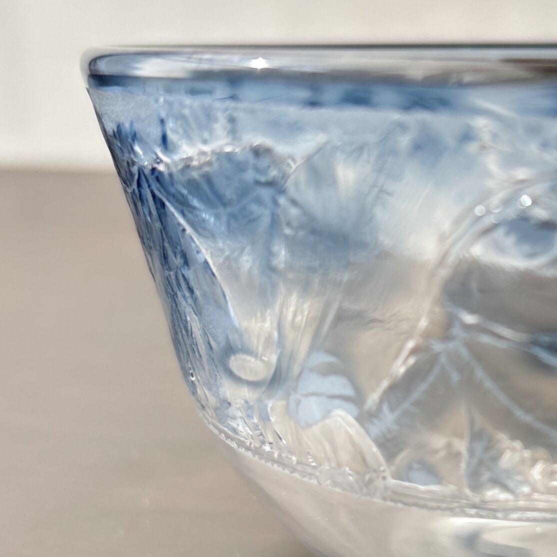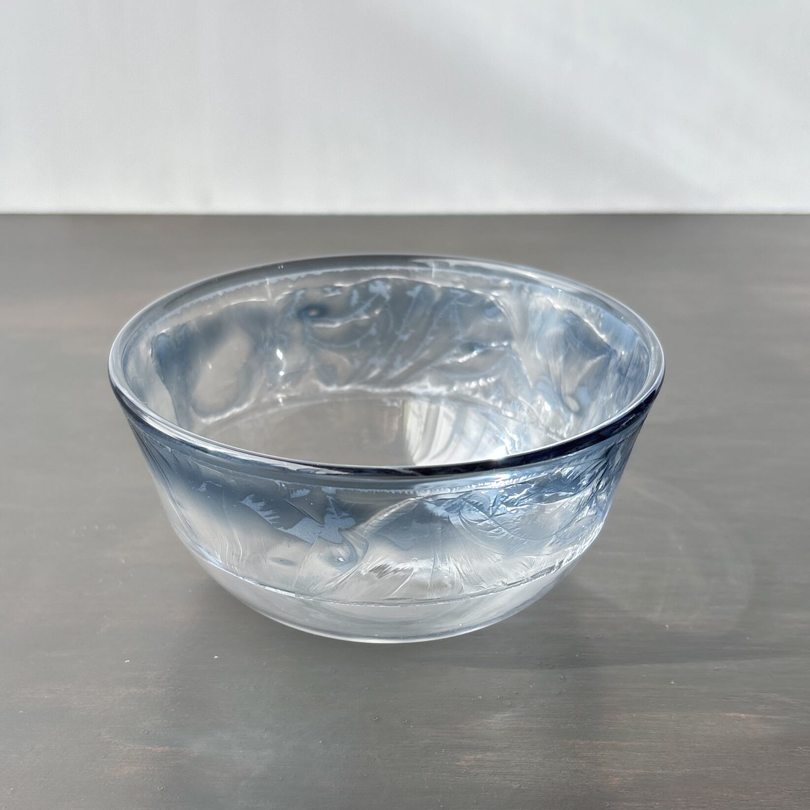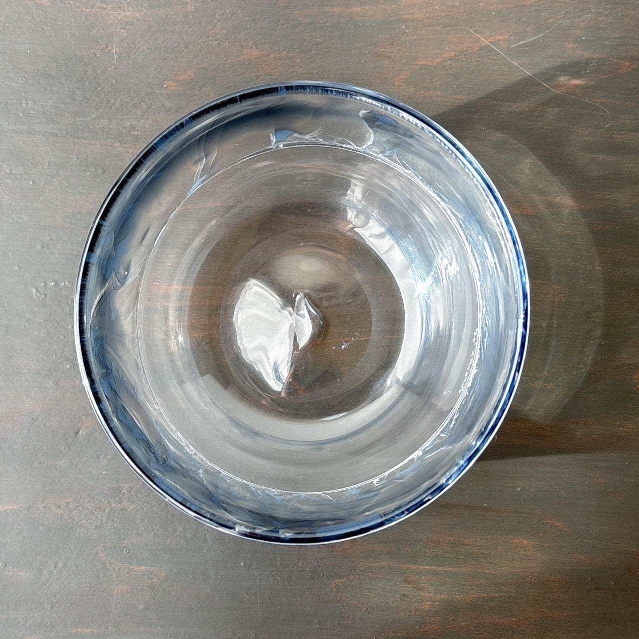 透明な紺色の色ガラスを一番外側に被せてボウルの形に吹き、