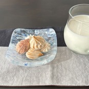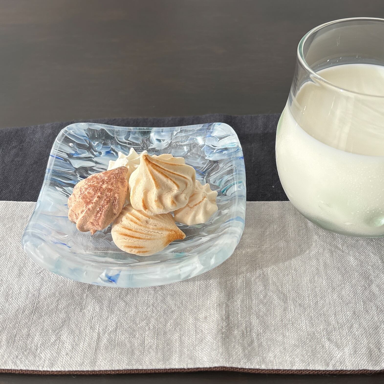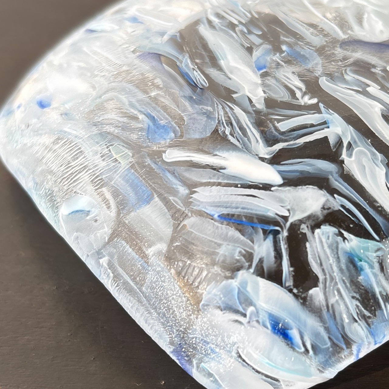 板ガラスにかけらを並べて焼く工程で泡が入り込んでいます。