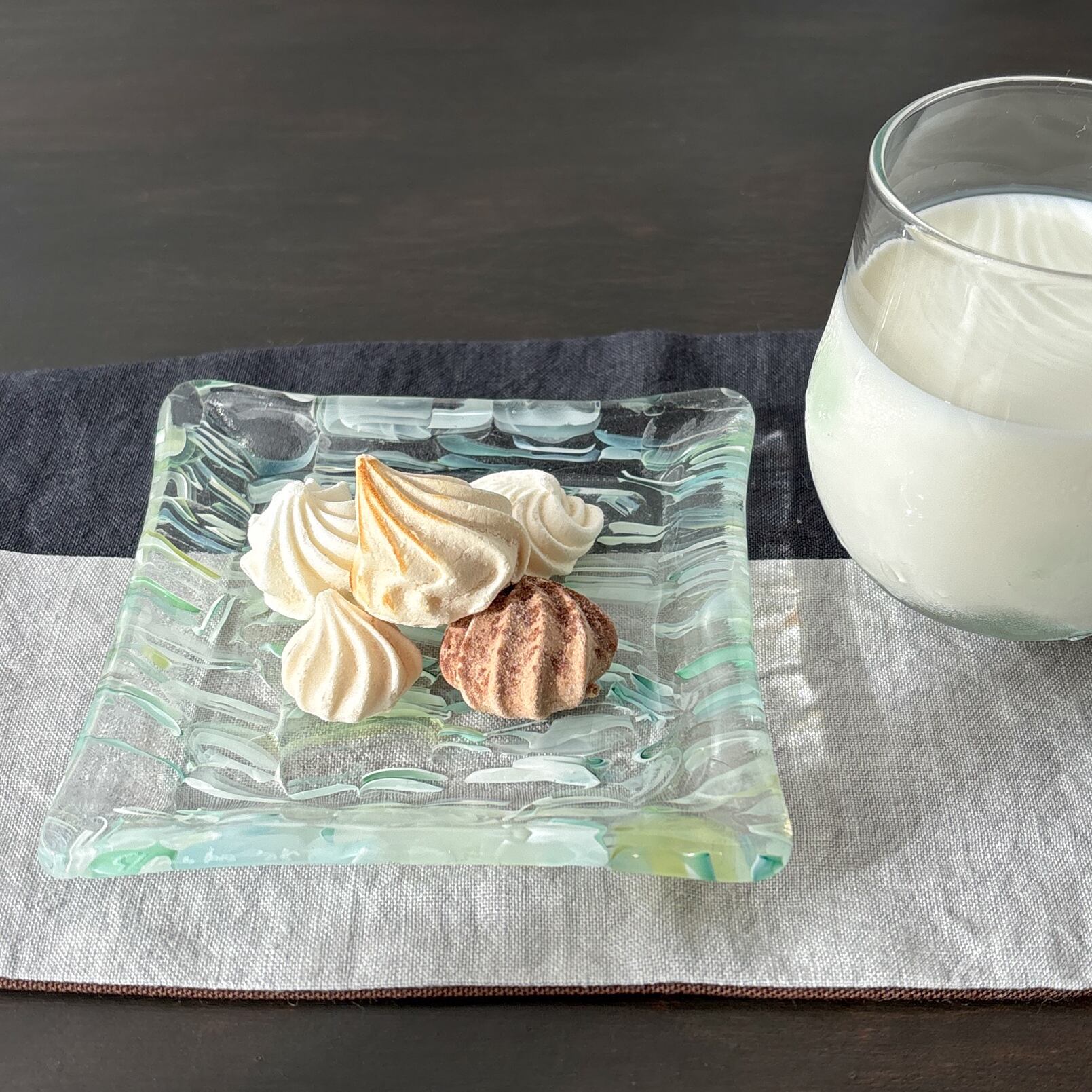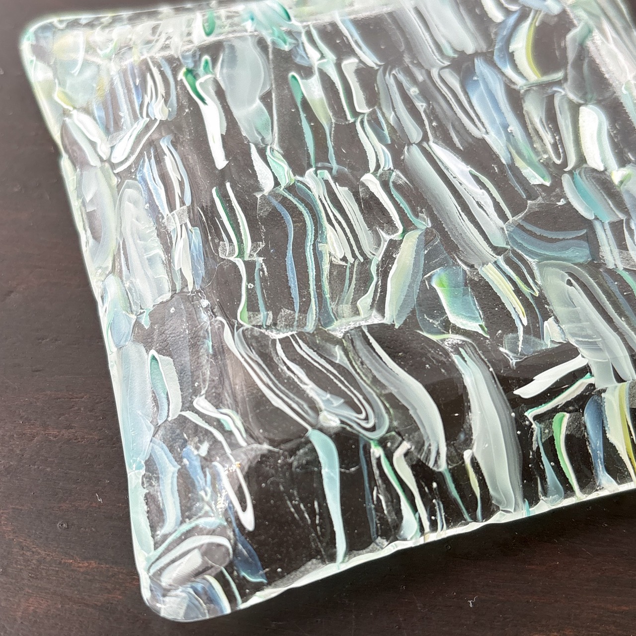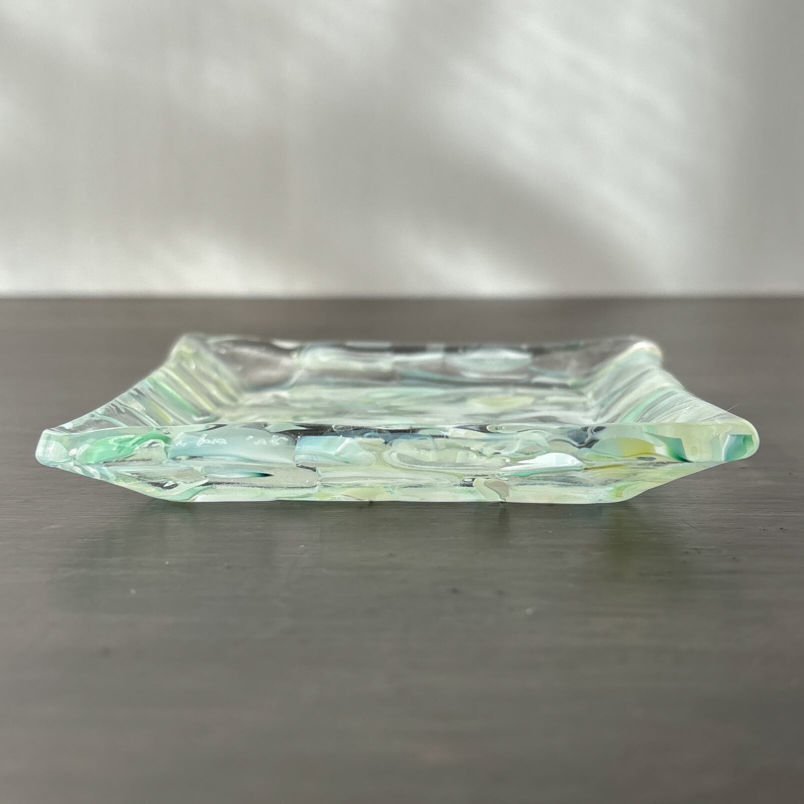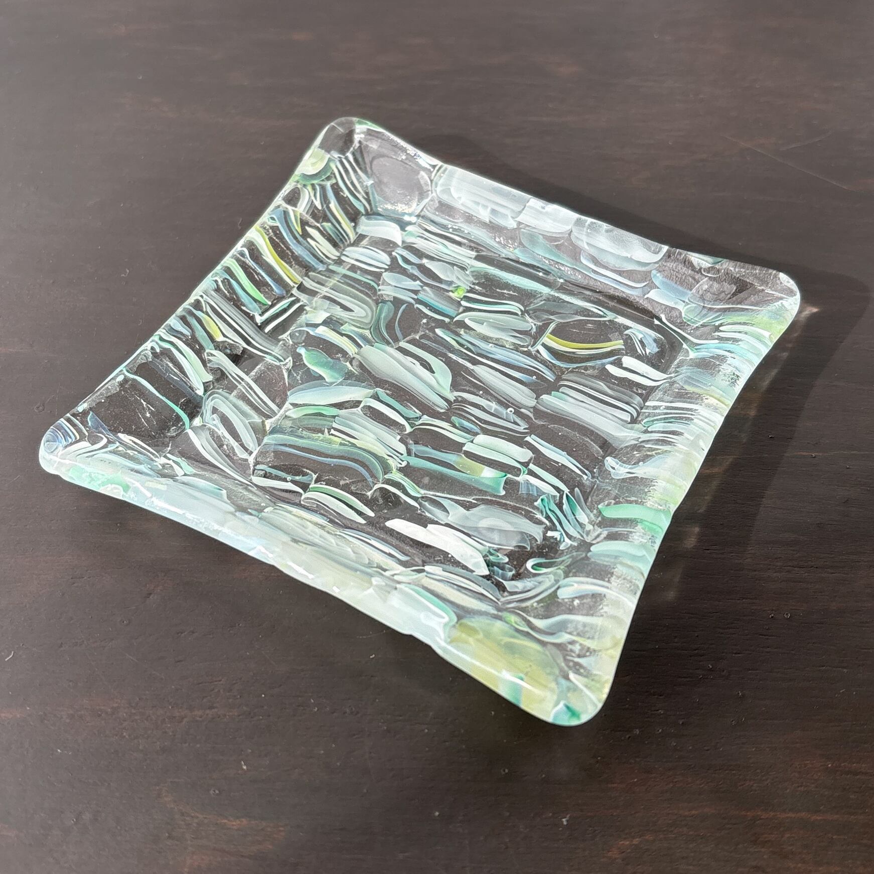 半透明の白と透明の緑色が並んだ模様の小皿です。