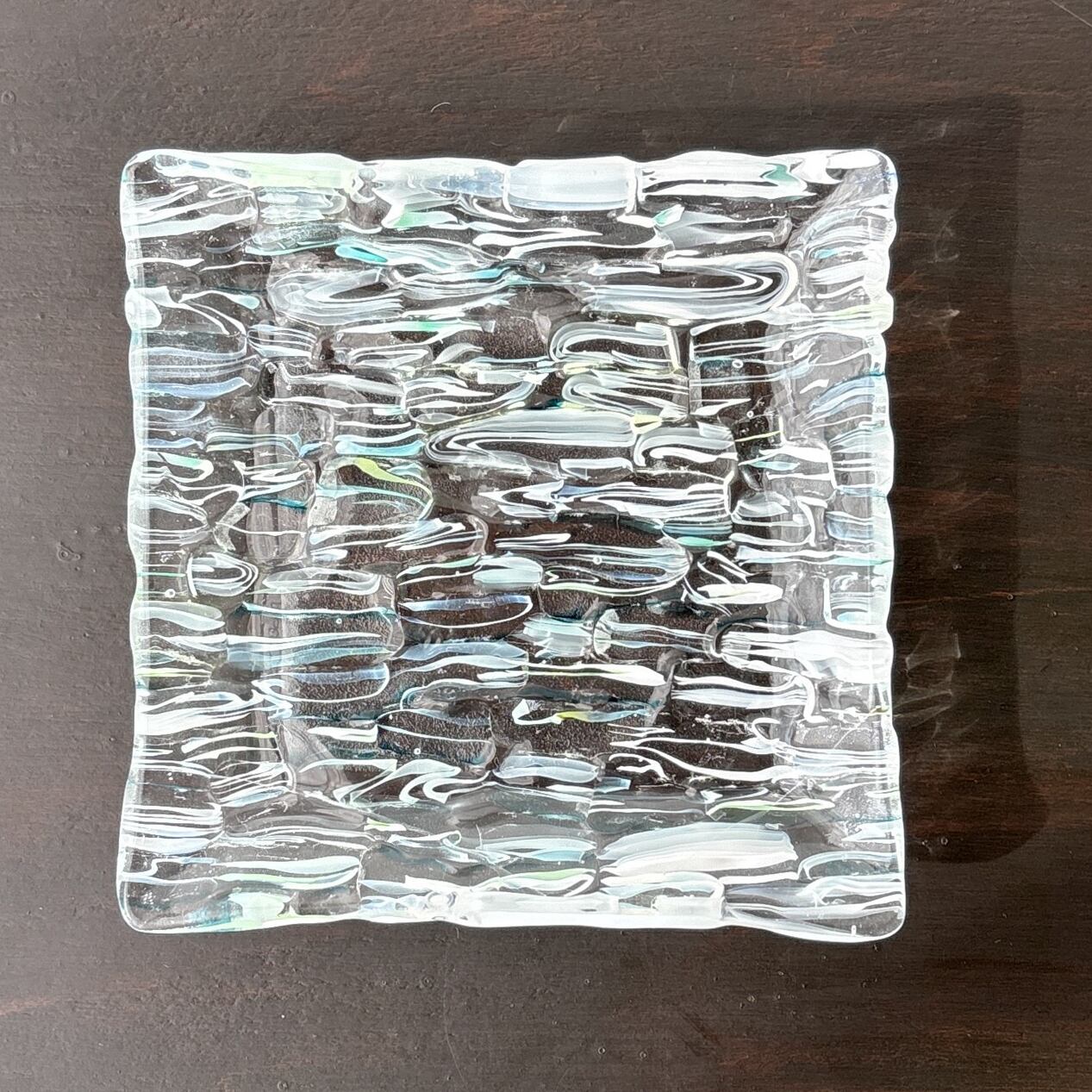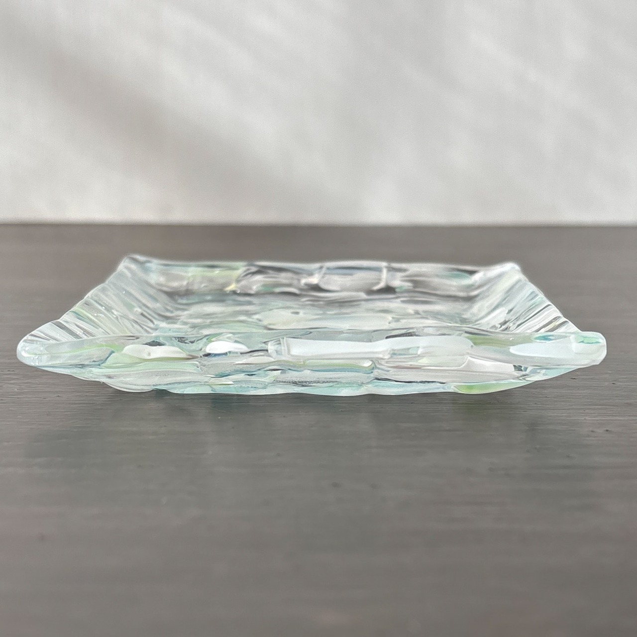 半透明の白と透明の緑色が並んだ模様の小皿です。