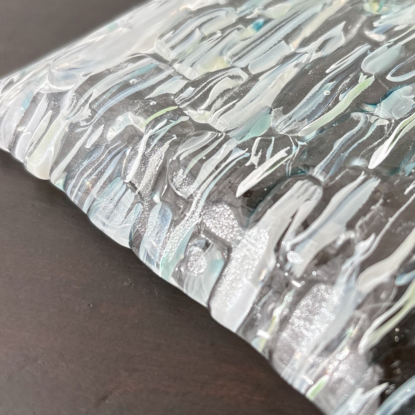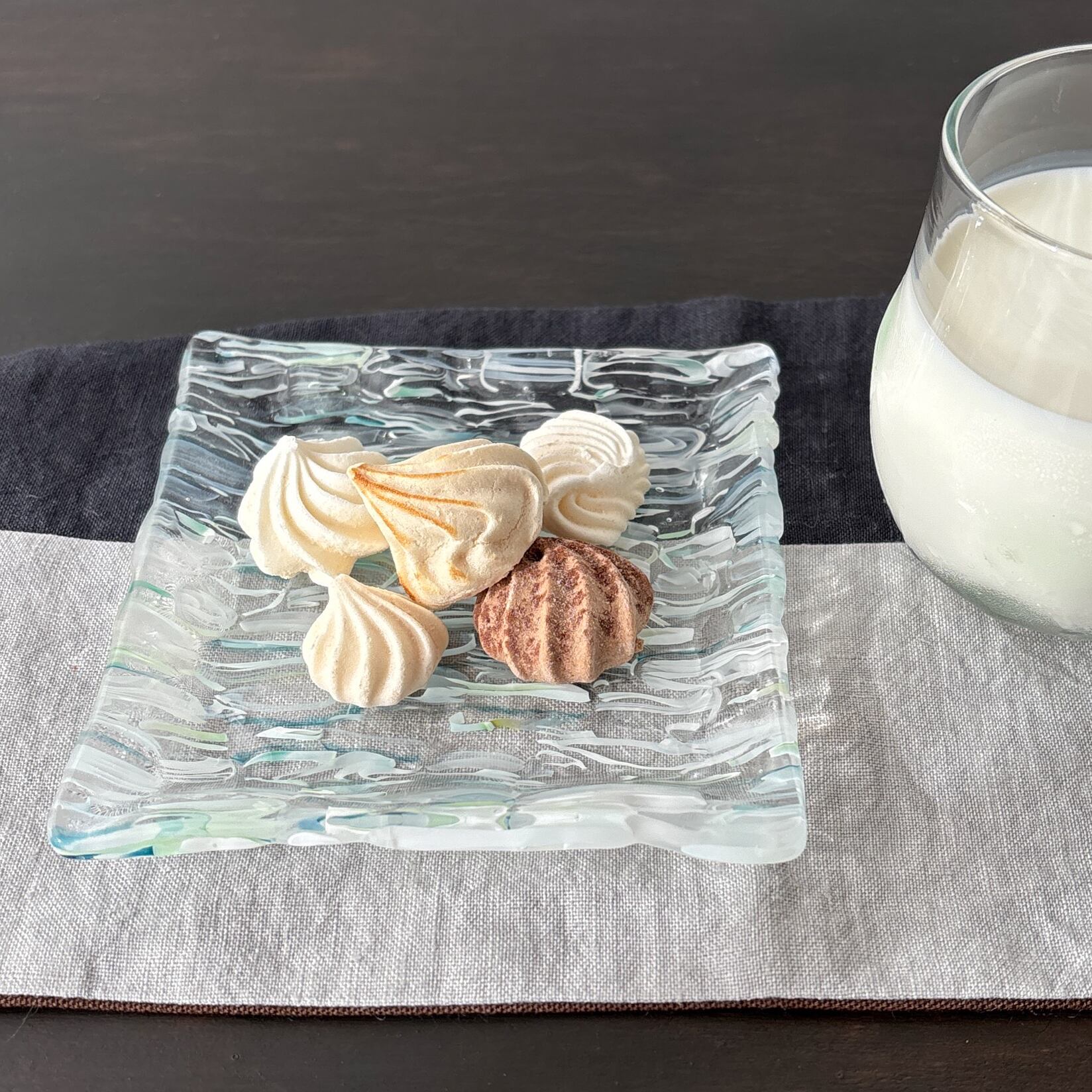 板ガラスにかけらを並べて焼く工程で泡が入り込んでいます。