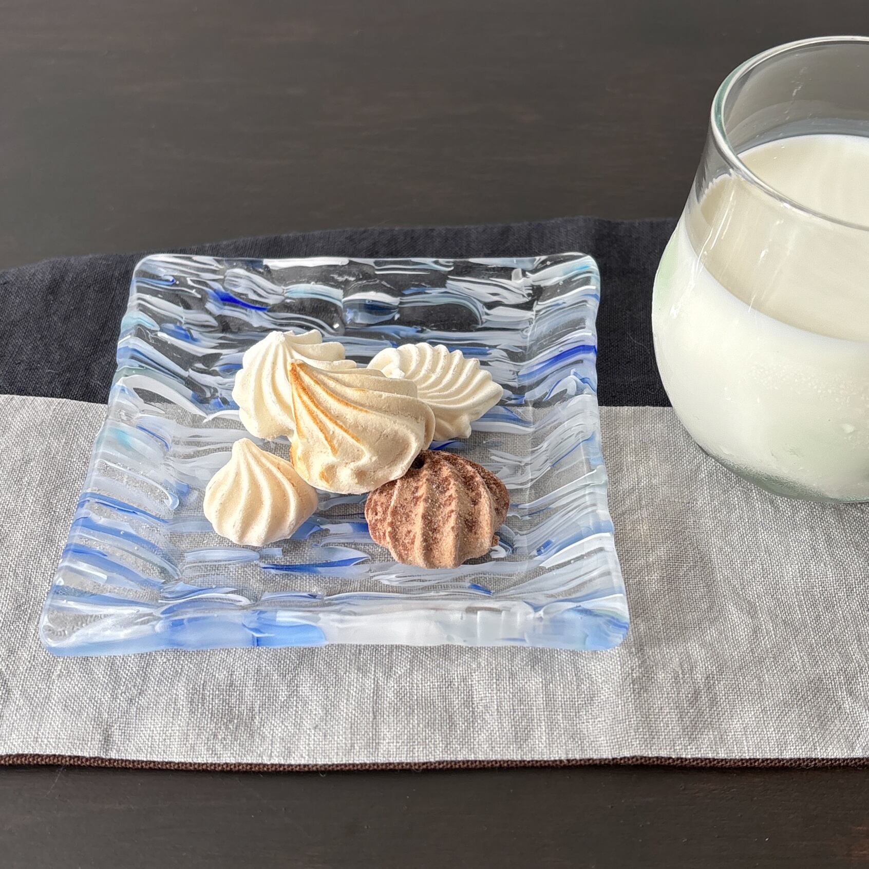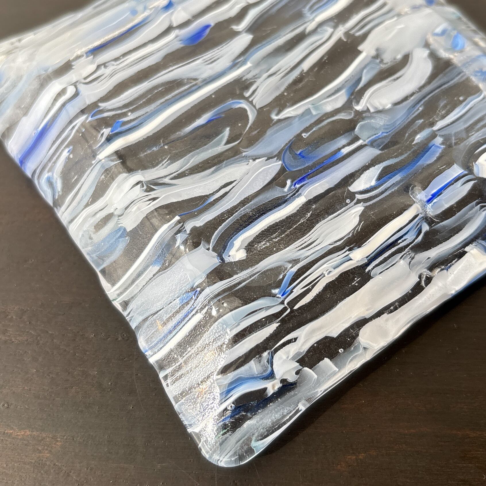 半透明の白と透明の青色が並んだ模様の小皿です。