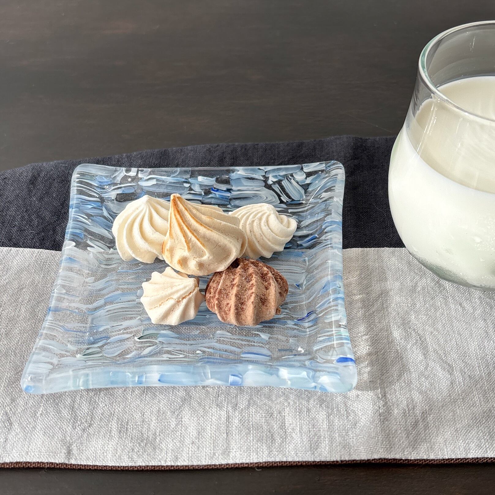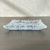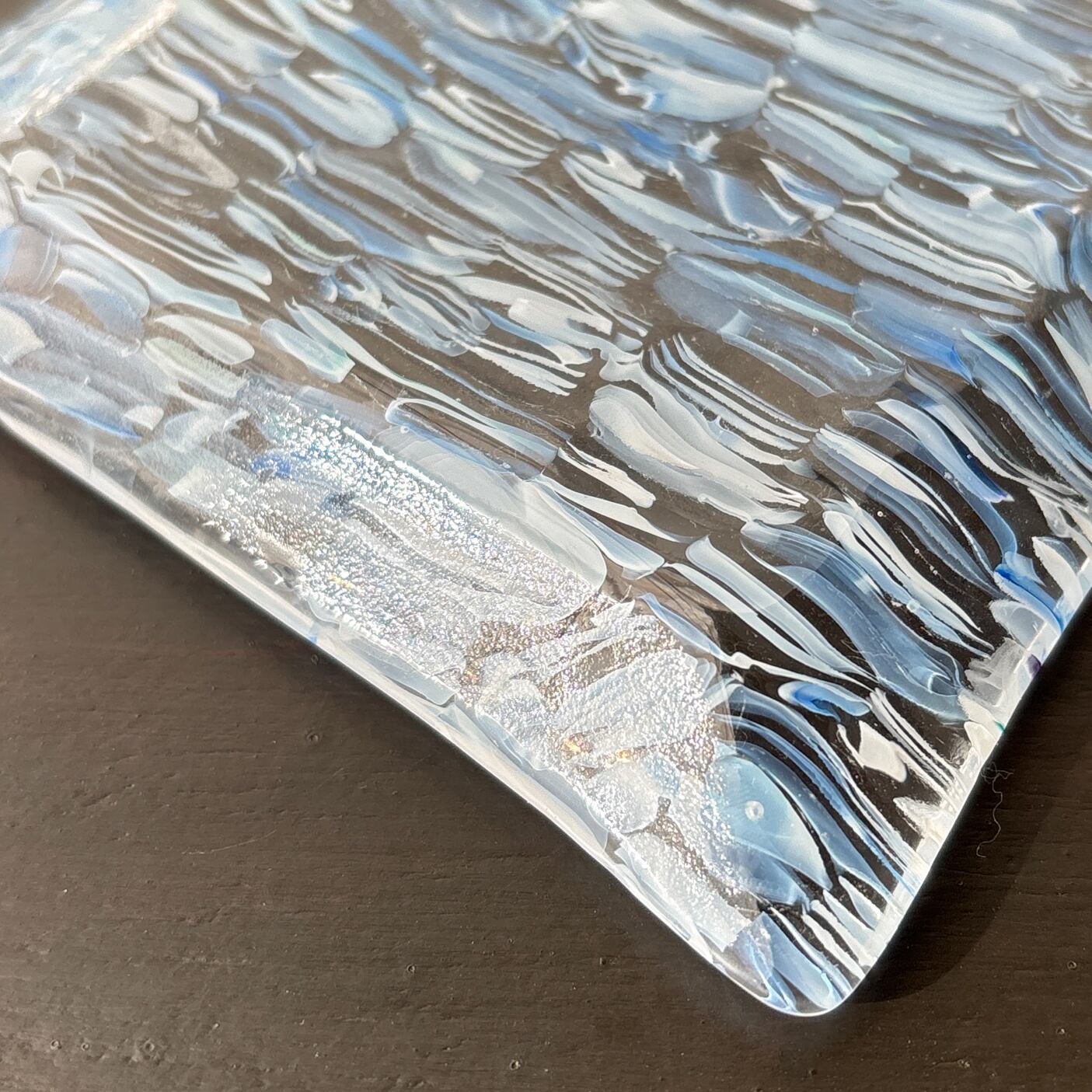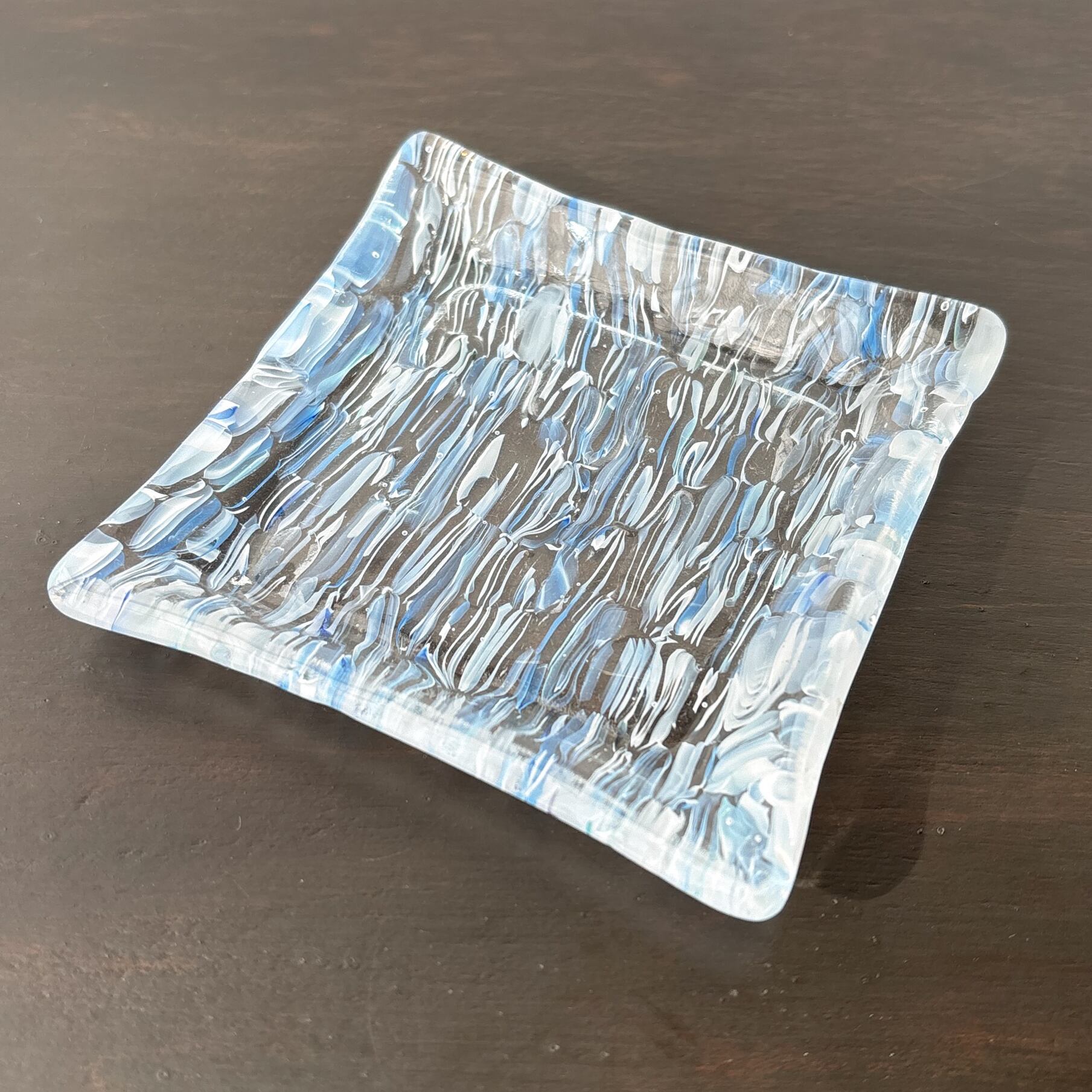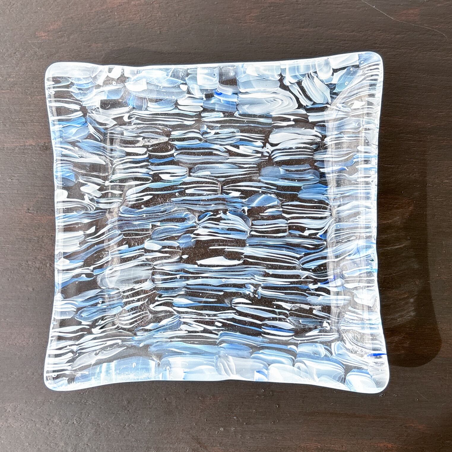 半透明の白と透明の青色が並んだ模様の小皿です。
