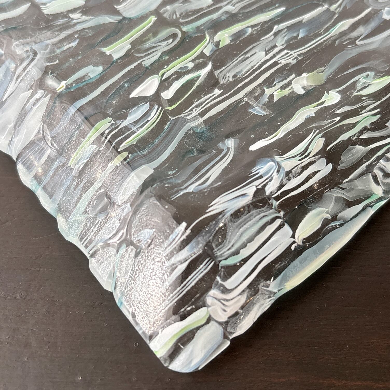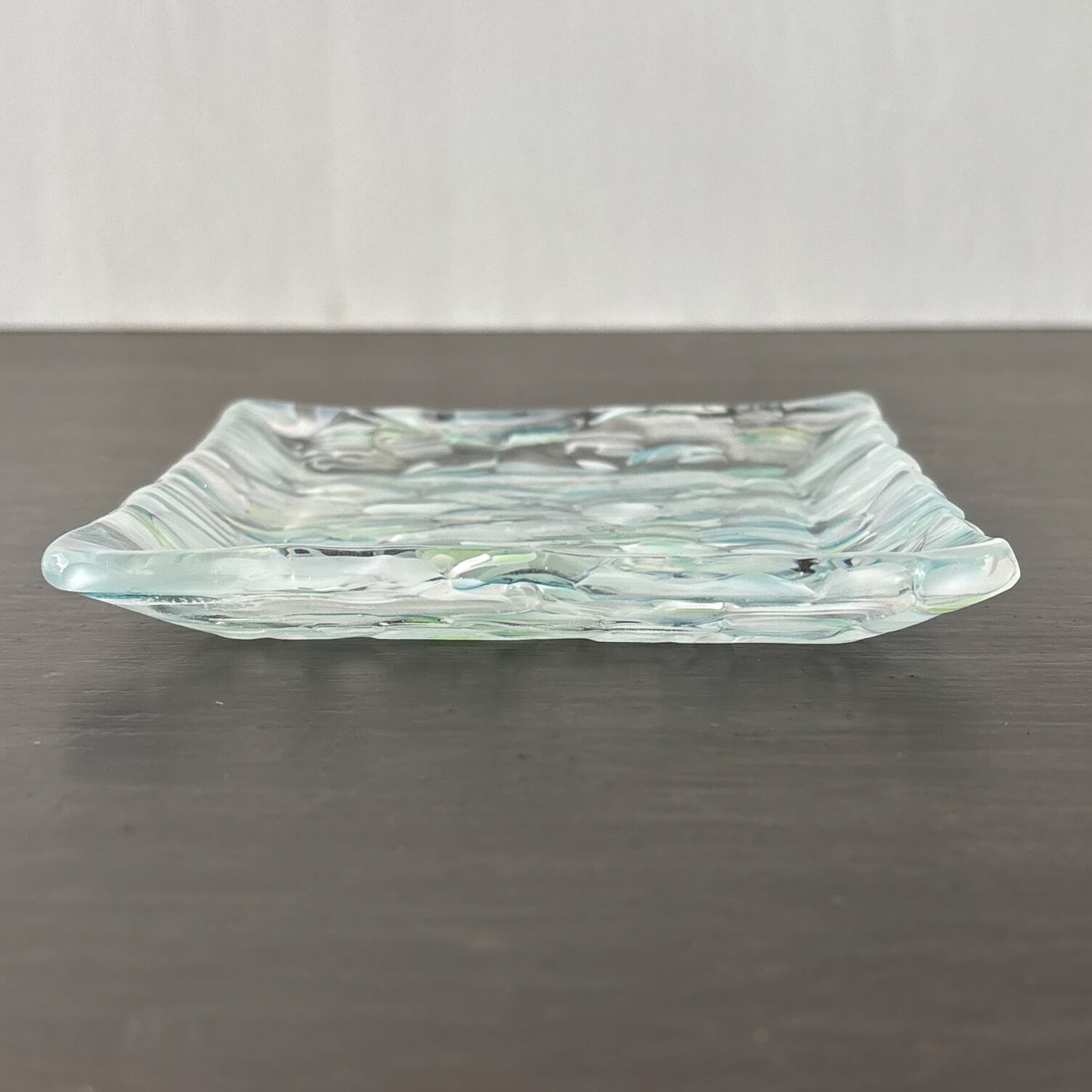 半透明の白と透明の緑色が並んだ模様の皿です。