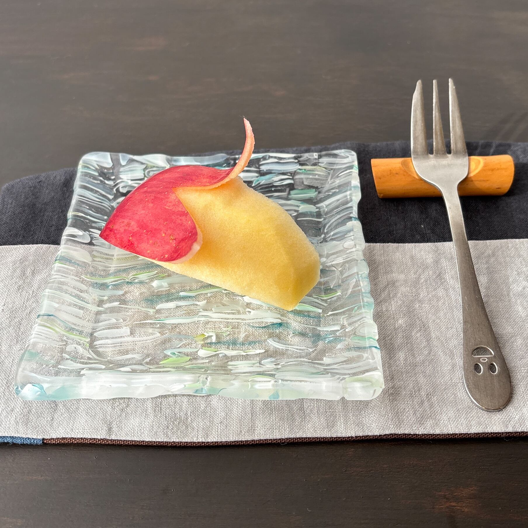板ガラスにかけらを並べて焼く工程で泡が入り込んでいます。