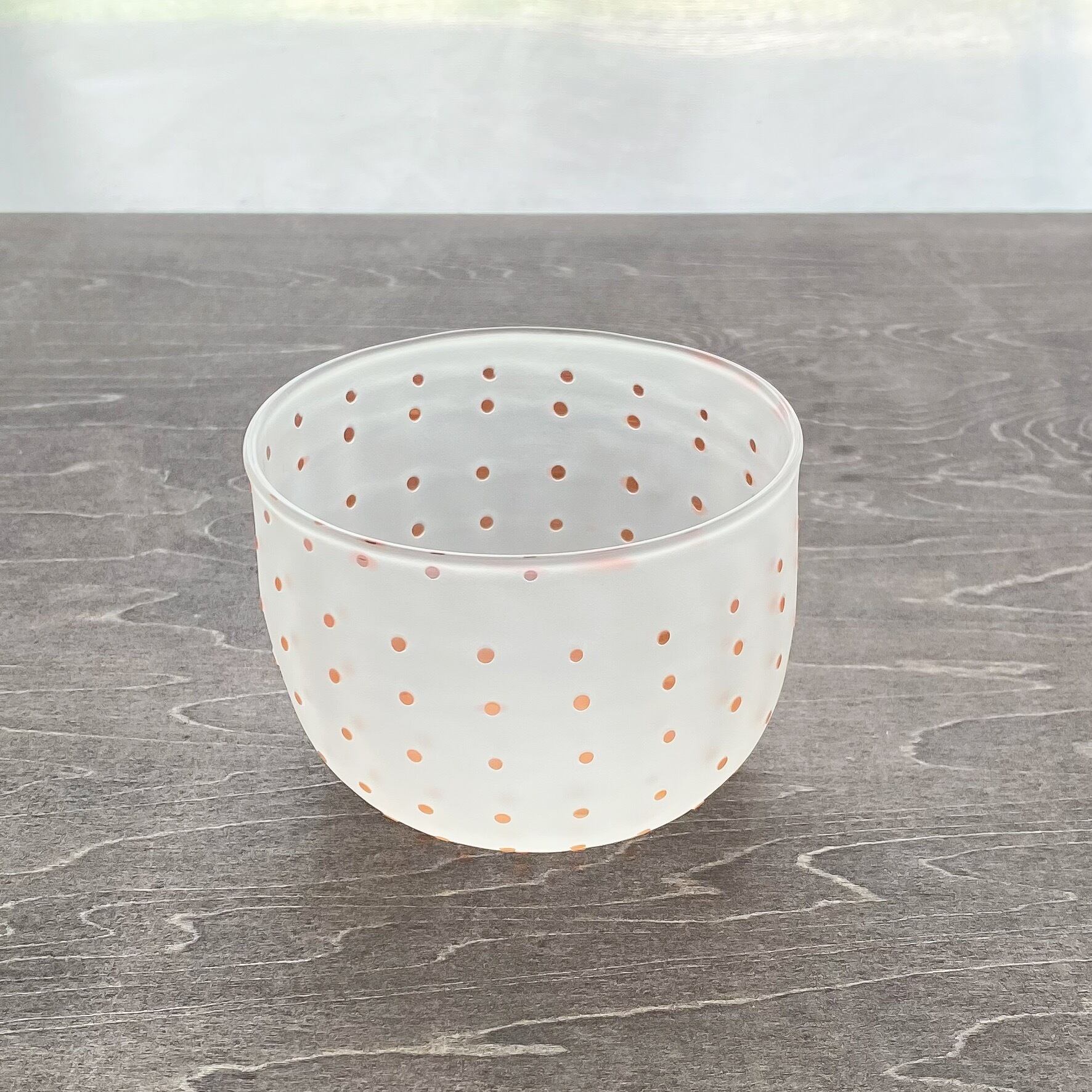 透明な赤茶色の点が螺旋状に付いている小さなカップです。
