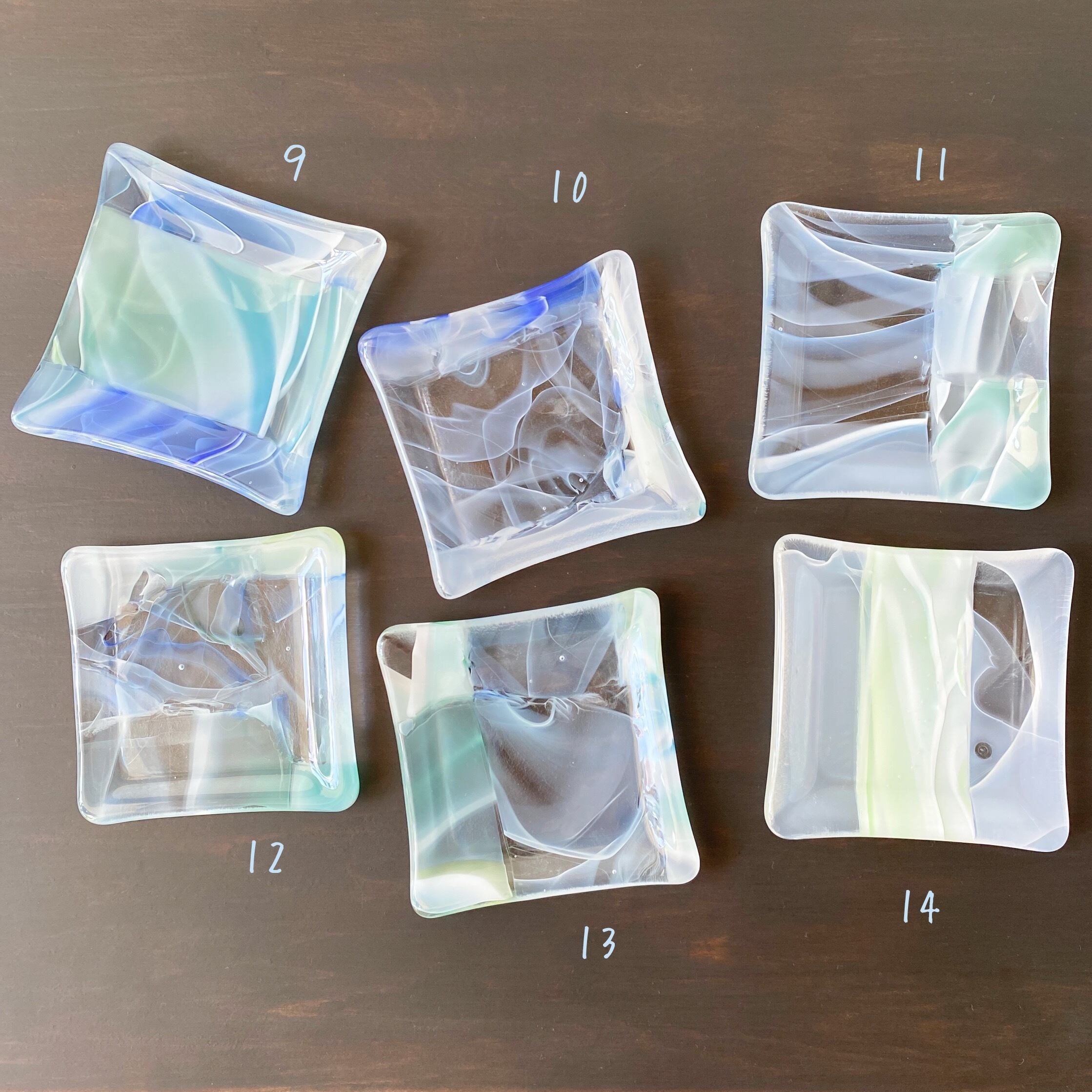 半透明の白と透明な緑と青が重なり合う模様の小皿です。