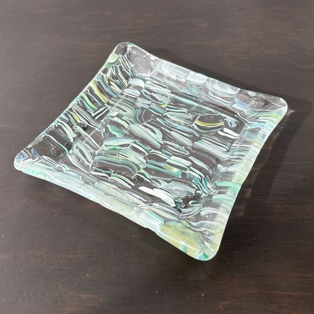 半透明の白と透明の緑色が並んだ模様の皿です。 『ゆらゆら 』というタイトルで制作している皿を作る際、 カットして出る小さなかけらを板ガラスに並べて焼成します。 (板ガラスも吹いて作ったクリアガラスです) 12cmほどの四角にカットして皿型にもう1度焼き上げました。 きっちりとした真四角ではありません。 焼成温度が高かったので、エッジが丸くなっています。 同じ模様が2つと出ない制作方法なので、それぞれ個性的になります。 板ガラスにかけらを並べて焼く工程で泡が入り込んでいます。 泡は割れそうなものは制作過程で処理しているので 残してあるものは割れる心配はありません。 皿の裏面は型に沿わせて成形するため、 ちょっと凹凸がありざらっとしています。(3枚目の写真) 2mmぐらいの板ガラスに2〜3mmのかけらを並べているので 少し厚みがあり、ちょっと重いです。 4枚目の写真ではリンゴウサギをのせてみました。 ディスプレイのフォークは約14cmです。 (波音 小皿以外は付属しません) *耐熱ガラスではありません。 *他サイトでも販売しており、先着順での販売となりますので、 万一売り切れの場合にはキャンセルでの対応となりますことをご了承くださいませ。 大きさ 1辺12cm×厚み5mm×高さ1.4cm 重量160g